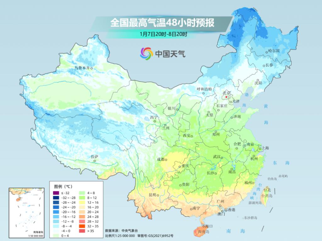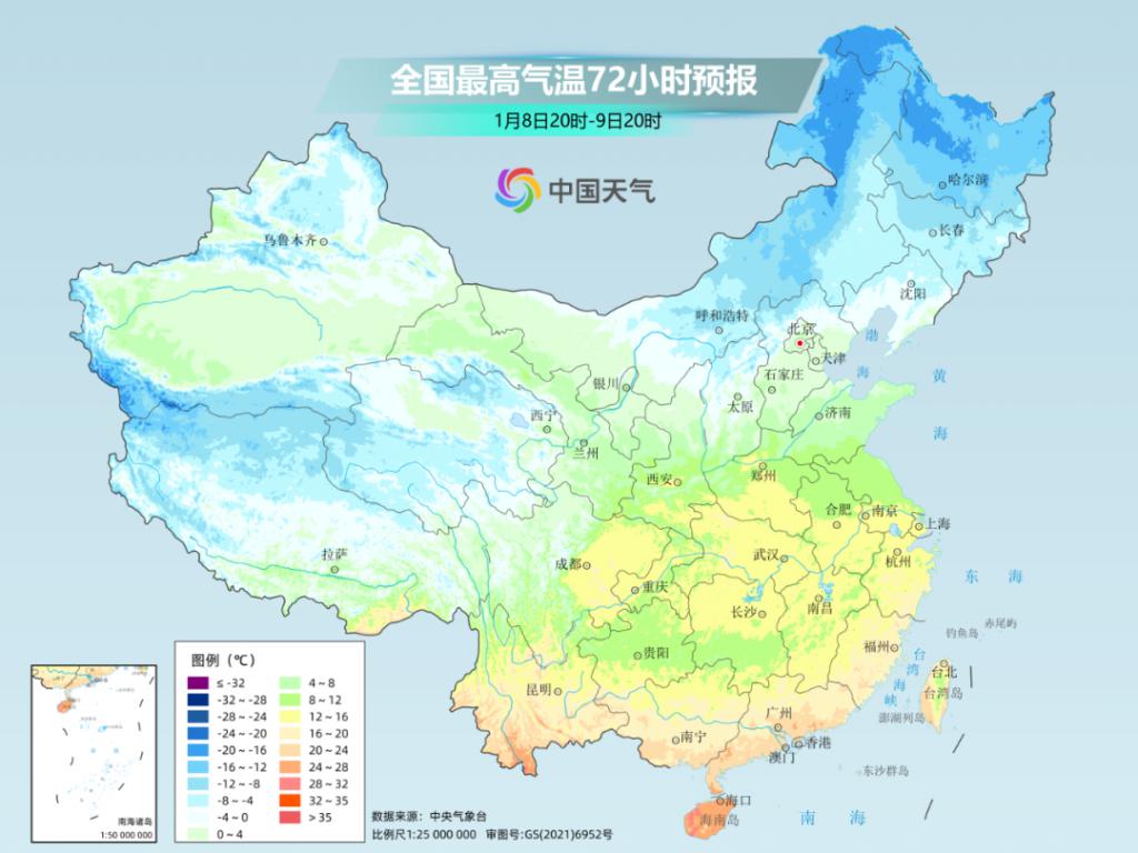 大城市中,像是沈阳,明天最高气温将下降到 -9 ℃,较常年 1 月上旬的 -4.9 ℃明显偏低。北京、天津明天最高气温都将下降到 1 ℃,南京、上海最高气温将下降到不足 10 ℃。
