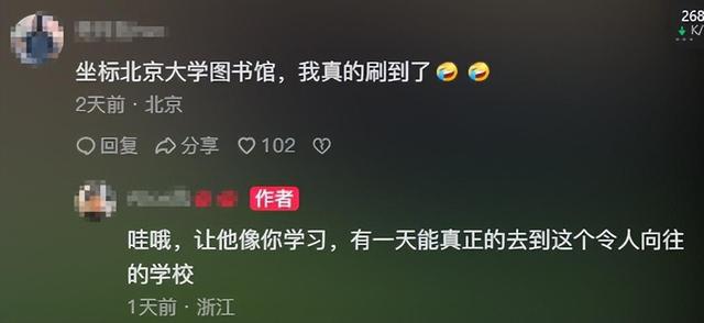 也有网友表示自己在北大图书馆刷到了这条视频,男孩家长称:" 让他向你学习,有一天能真正的去到这个令人向往的学校。"