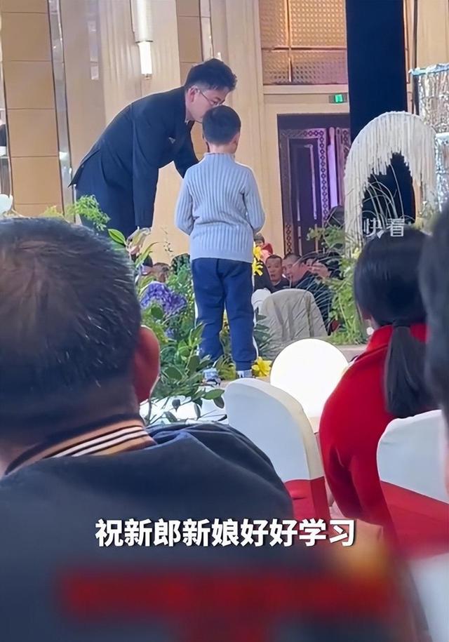 随后,男孩又对新人送上祝福:" 祝新郎新娘好好学习,祝他们的爸爸妈妈天天向上。"
