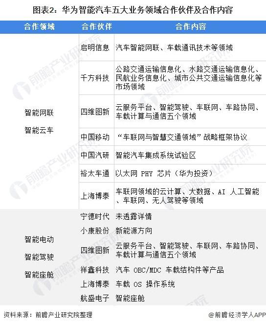 华为在智能汽车五大业务领域,均与相关企业在产业链上下游建立了合作关系,联合了通信、整车、零部件以及互联网企业打造了智能汽车生态圈。