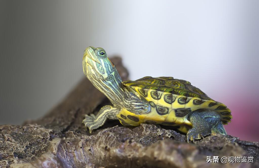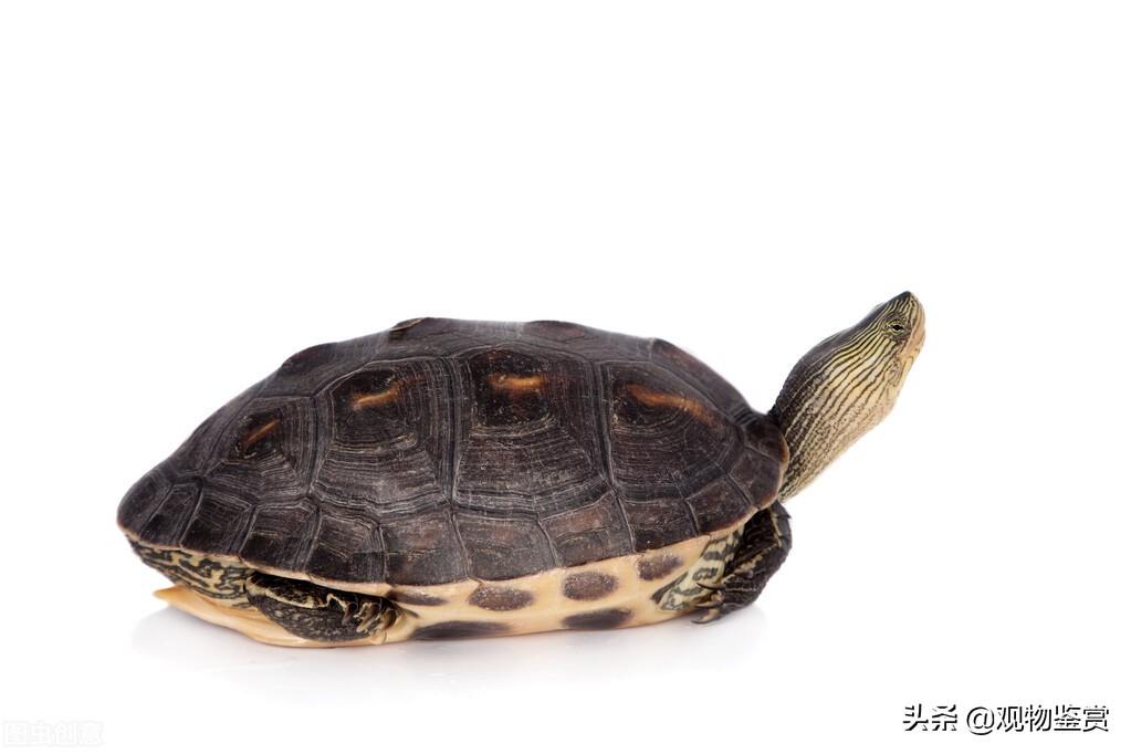 它的特征是头部两侧有红斑,也叫巴西红耳龟。由于这种龟性情活泼,也比较适合作为宠物。不过不要选择背上有印花的,这种印花是油漆,对它的健康不利。
