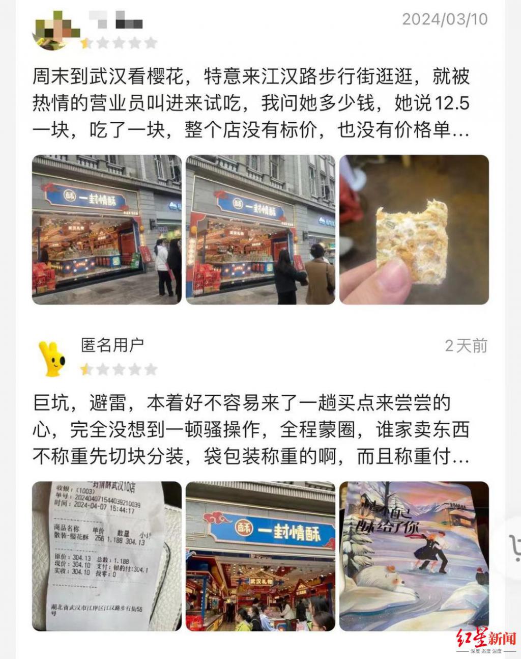 美食团购平台上给江汉路 " 一封情酥 " 打差评的游客,描述的 " 被坑 " 经历与丁女士的遭遇大致类似:进店后,店员对商品价格含糊不清,不明确说明 12.8 元一块、一斤还是一两;未结账时,店员先切块再称重;结账时,不提前告知价值直接让顾客扫码;如有纠纷,则以 " 已经切好 " 为由拒不退款。