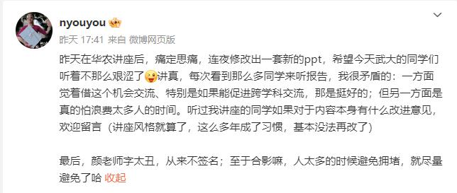 据悉,6 月 12 日,颜宁还去到了华中农业大学。6 月 13 日,颜宁还发文回顾了自己在华农讲座的经历,在去武大之前连夜修改了 PPT。她还称,看到那么多同学来听报告,一方面觉得借这个机会能促进跨学科交流是很好的,另一方面又怕浪费太多人的时间。最后,她还请听过讲座的同学提改进意见。