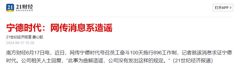 6 月 17 日,网传宁德时代施行 "896" 工作制,登上热搜。