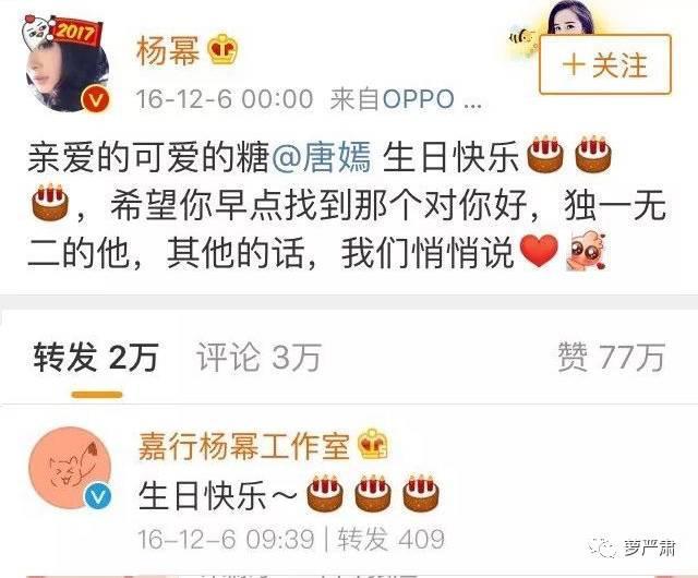 然而2016年以后杨幂和唐嫣渐行渐远,最明显的标志是2016年杨幂刚祝福唐嫣生日快乐早点找到意中人,隔天唐嫣和罗晋就官宣了,可见杨幂唐嫣那时候已经不太熟了。(最近频繁“发糖”的变成了杨幂和刘诗诗,唐嫣和刘亦菲。)