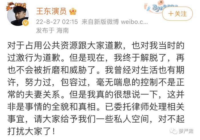 上周日,王东妻子曝光了他家暴的视频。此前王东妻子曾多次发布微博称自己生孩子王东却失踪了,连生存都成问题,并回复网友评论说王东在自己孕期出去约炮。家暴视频引发关注后,王东仅回应这不是正常夫妻关系,不是全貌和真相,把暴力行为轻描淡写称为“过激行为”。