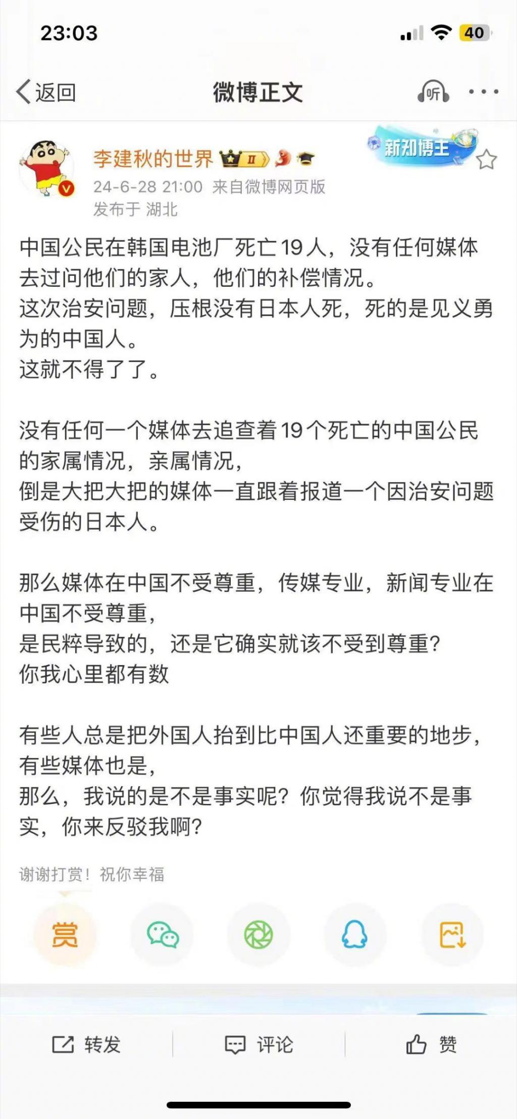 看到多个网帖把苏州伤人事件与韩国 19 名中国人在锂电池工厂遇难事件作对比,前者备受关注,后者却鲜有回响。老胡支持这个对比,同时我认为,用对比提醒我们对韩国事件关注的不够很有说服力,但是如果要以此证明对苏州事件的关注是过度的,又站不住脚。如果将这种关注度偏差一味怨到媒体头上,则严重不客观。