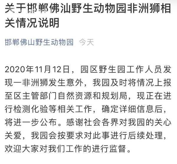 13日17点17分,邯郸佛山野生动物园官方公众号发布声明称:2020年11月12日,园区野生园工作人员发现一非洲狮发生意外,我园及时将情况上报至区主管部门自然资源和规划局,现正在进行检测化验等相关工作,确定详细信息后,将进一步公布。感谢社会各界对我园的关心关爱,我园会按要求对此事进行后续处理,欢迎大家对我们工作的进行监督。