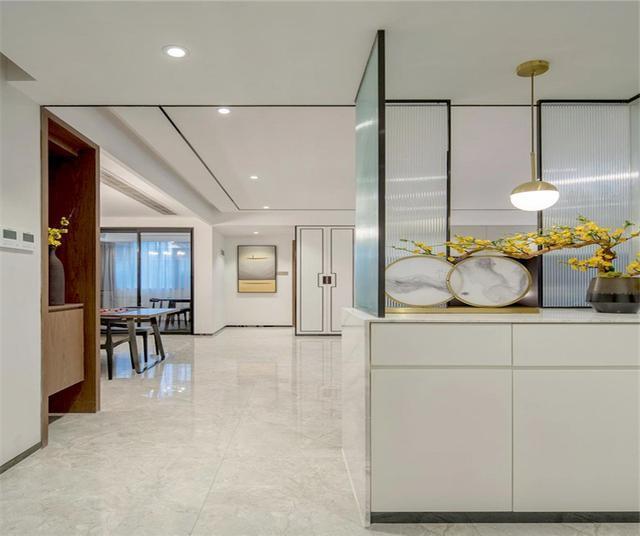 本案是幸福的三口之家,有一个可爱的小公主,男业主喜欢中式风格,女业主喜欢现代中式,在做选择中,彼此意见不一。最后做决定的时候,还是听从了女业主的决定。进门处做成一个入户厅给了个轻食台,吧台上面做了个半透屏风,增加采光,整体是中性灰色调,墙面选择中性浅灰色墙布。