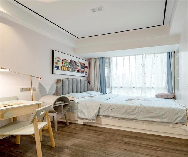 床头背景墙选择软包的方式,方便孩子学习,还把小书桌也放到了房间里~