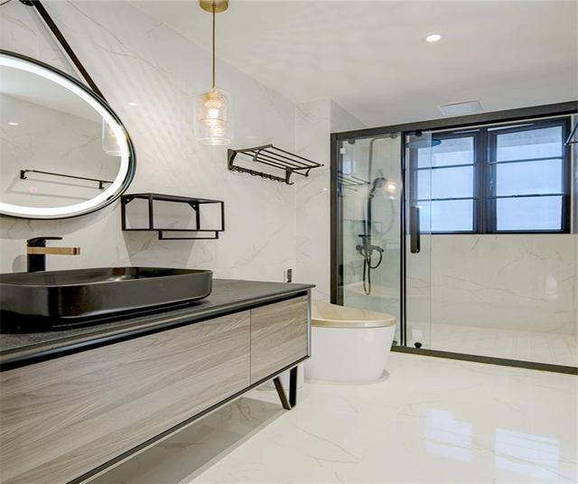 卫生间采用传统干湿分离的形式,黑色的台上盆看着质感满满,但是还是建议打击做台下盆,比较好打理~