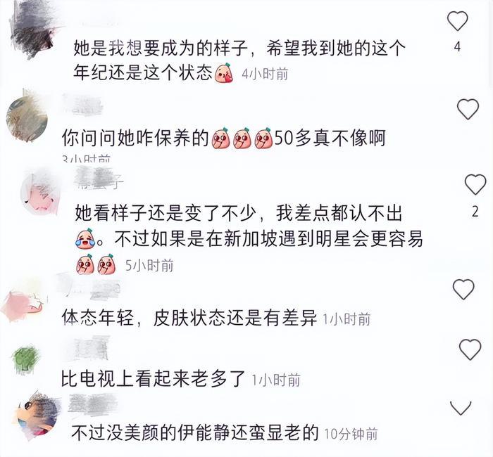 不过还是有人表示伊能静变了不少:“她看样子还是变了不少,我差点都认不出”“体态年轻,皮肤状态还是有差异”“比电视上看起来老多了”。无论网友如何评价,伊能静的保养之术确实让人羡慕。