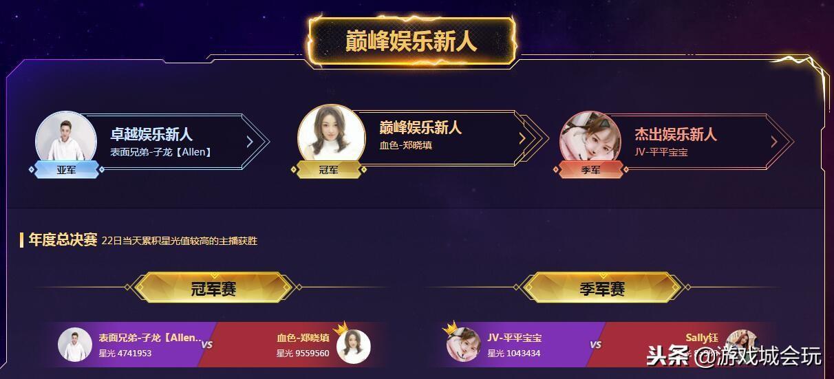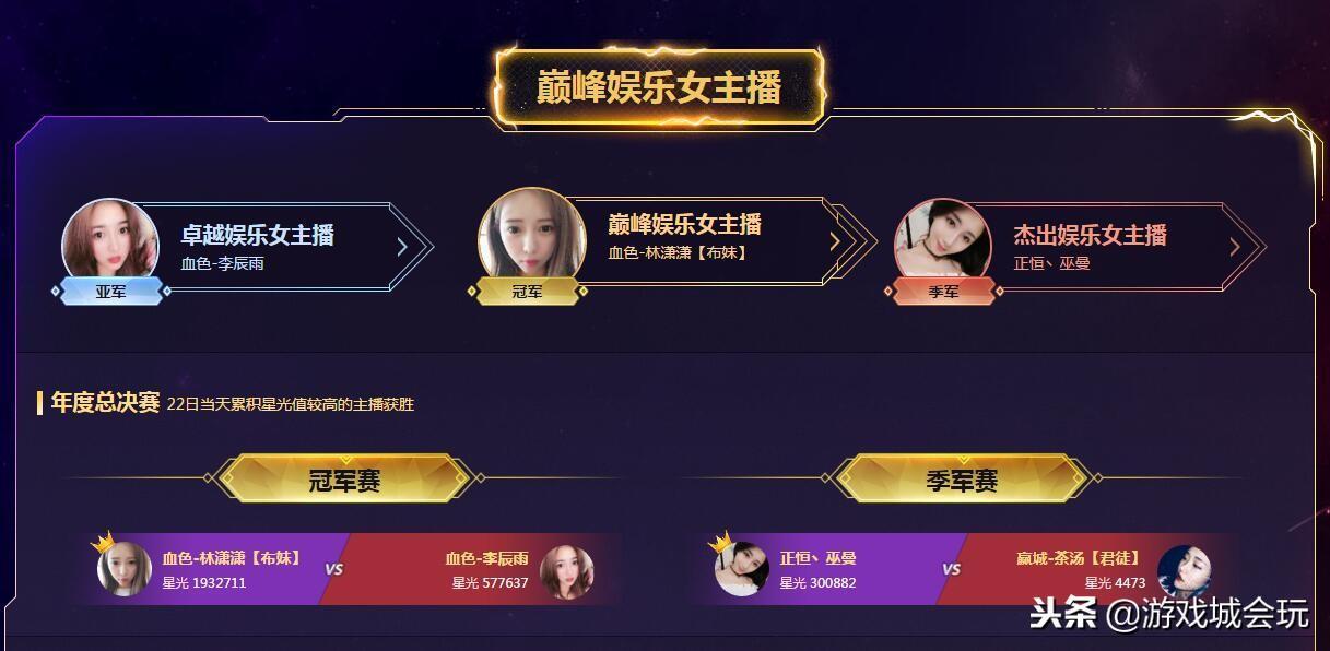 娱乐区同样也分为巅峰娱乐男主播、巅峰娱乐女主播和巅峰娱乐新人三个荣誉,但冠军完全没有任何的悬念全部被血色公会拿走。血色公会背后拥有烟雨楼超级神壕团的支持, 制霸了今年的虎牙年度,并拿到了众多冠军,而年度娱乐区的冠军也被血色全部包揽了。