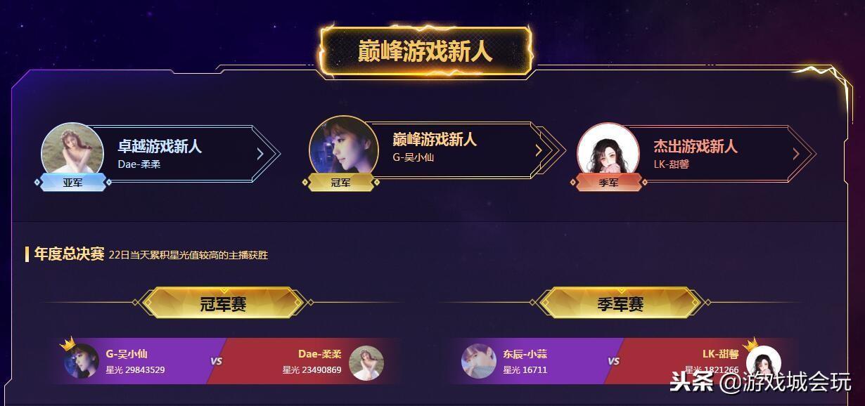 巅峰游戏新人的冠军之争很激烈,两大主播都打出了200万元的礼物,最终吴小仙在血色公会神豪的支持下赢得这场PK成为年度巅峰游戏新人。