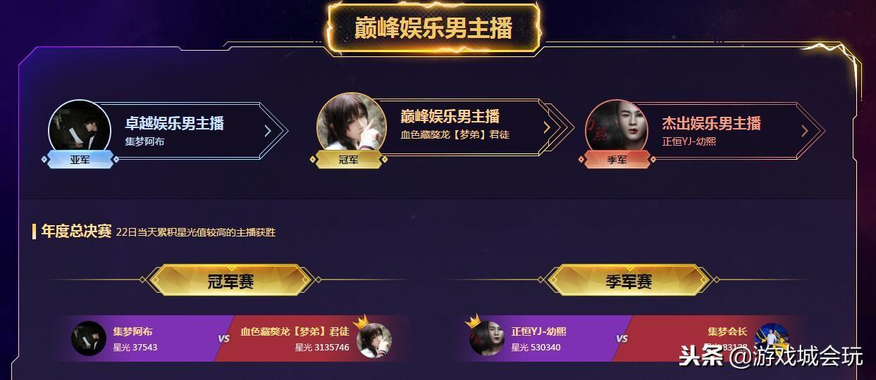 巅峰游戏男主播的决赛并没有真正竞争起来,DNF主播狂人打出了150万元的礼物获得冠军,而王者荣耀主播心态打出61万排名第二。在季军争夺战中楚河毫无悬念赢得胜利,并收获杰出游戏男主播的荣耀,楚河也是晋级到四强最大牌的主播。