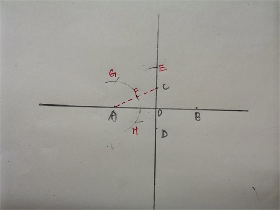 3、第三步以O为圆心,OA长为半径画圆,然后交CD线于点E