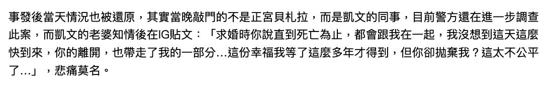 他的妻子贝扎拉虽然不是圈内人,但她非常优秀,是位高智商的女律师。当天她并没有去捉奸,门外的只是凯文同事,在得知丈夫去世后贝扎拉伤心欲绝,心痛发文称对方抛弃了自己。