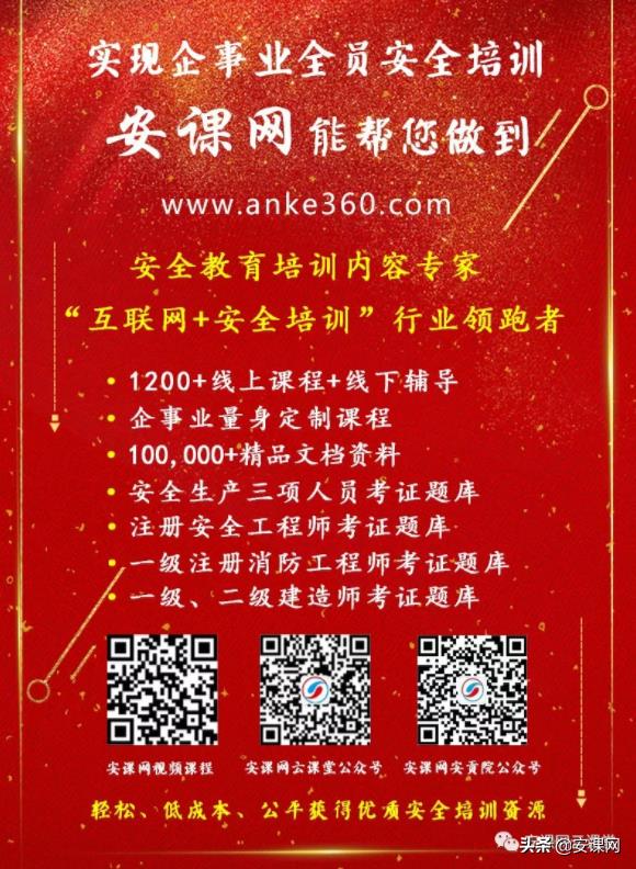 安课网www.anke360.com,安全教育培训内容专家,“互联网+安全培训”行业领跑者。安课网已经上线的1200+线上安全培训视频课程,覆盖全行业,系统、全面、专业、深入、实用。安课网还提供50000+精品安全生产文档资料、安全生产三项人员考证题库、一建和二建考证题库、一级注消考证题库、注安考证题库。安课网线上+线下安全培训,能够帮助企事业单位实现高效、全员安全培训,提升企事业单位本质安全水平。