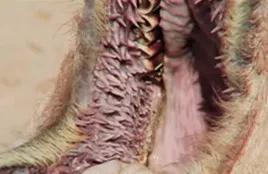 骆驼也进化出专门对付仙人掌刺的武器,他们能细嚼慢咽地吃下仙人掌,毫不在意上面布满的尖刺。这是因为骆驼的口腔中布满了像钢铁一样坚硬的甲胄。骆驼的嘴巴外部非常的厚实粗糙,为啃食仙人掌提供了保护层,能够有效地防止他的嘴巴被扎伤。而其口腔的内部覆盖着密密麻麻的肉状尖刺,甚至连舌头都铺满了密密麻麻的尖刺,平铺在骆驼的口腔和舌头上。