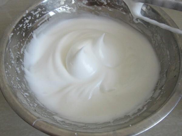 5. 再分三次加入白糖,直至打发至硬性发泡的状态(提起打蛋头呈小弯勾)