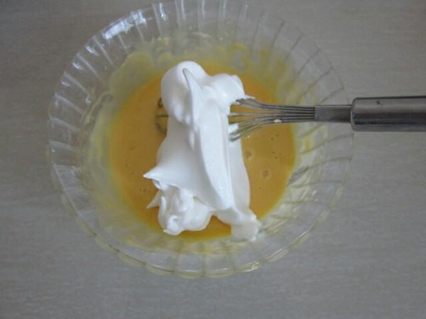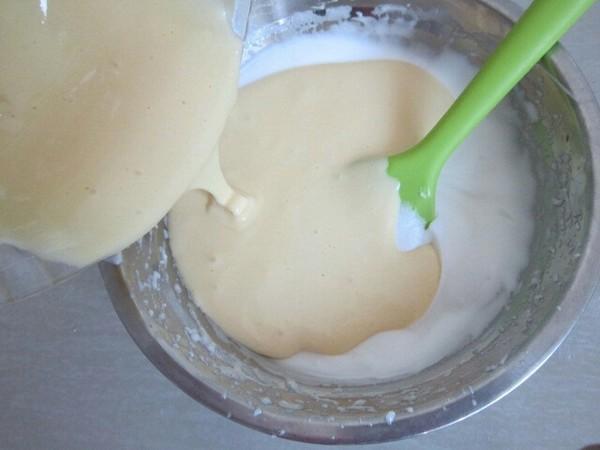 6. 将3分之一蛋白霜倒入蛋黄糊中混合。