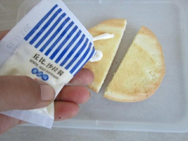 10. 烤好的蛋糕稍放凉后对半切开,内则抹上丘比沙拉酱