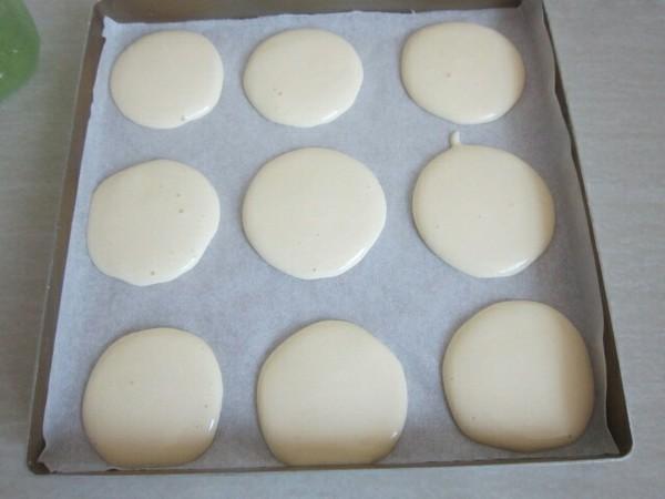 9. 在垫了油纸的烤盘上挤上大小相等的圆,放入预热好的烤箱160度烤16分钟。
