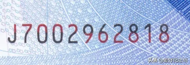 票面正面左下方印有横号码,由红色和黑色两种颜色构成,前五位上半部分为红色,下半部分为黑色,后六位上半部分为黑色,下半部分为红色,右侧竖号码为红色。横竖号码均由一位冠字“J”与十位阿拉伯数字组成。