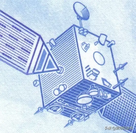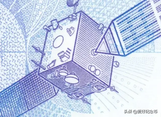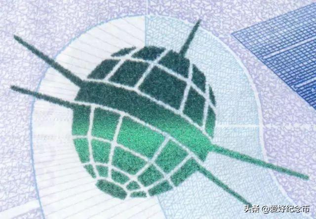 位于票面正面左侧的东方红一号卫星光彩光变图案,垂直票面观察,图案为绿色;平视观察,图案为蓝色。随着观察角度的改变,图案颜色在绿色和蓝色之间交替变化,并可见到一条亮光带上下滚动。