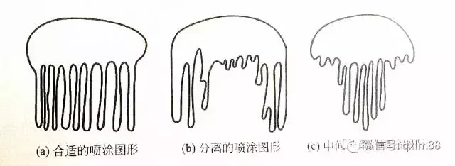 各段流挂的长度应该近似相等。如果流挂呈分开的形状,是由于喷束太宽或气压太低。把雾形控制阀拧进半圈,或把气压提高一些,交替进行