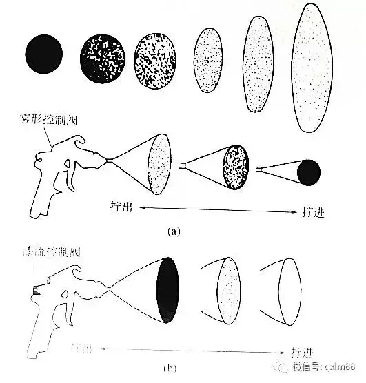 用漆流控制阀按选定雾形调整漆流量,将控制阀拧出时漆流量增大,控制阀拧进时漆流量减少。