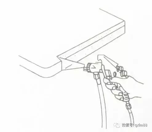 ⑧大型水平表面的走枪手法。喷涂大型水平表面如发动机罩、车顶、行李厢盖等,可以采用长而直立构件平面的走枪手法,即由左至右移动喷枪至临近基材表面时扣扳机,继续移动喷枪至离开基材表面时放开喷枪,这样可以获得充分润湿的图层,而不过喷或干喷最少。