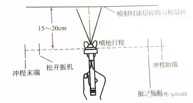 ⑥大圆柱构件的走枪手法。喷涂大圆柱体时,则由左至右再由右至左,水平行程,依次喷完。
