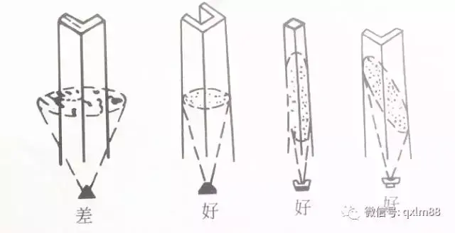 (2)喷枪与工作表面的角度。喷枪与工作表面必须保持垂直(90°),绝对不能由手腕或手肘作弧形的摆动。