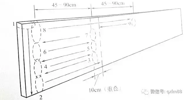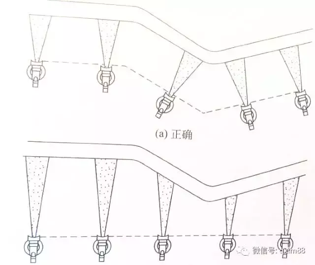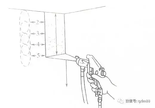 ④长而直立的构件平面的走枪手法。喷涂长而直立的构件平面时也是由上而下进行,再由左而右,依次沿横向行程,每行程45~90cm,即按板长方向分段进行,每段之间交接处,有10cm左右的行程重叠。