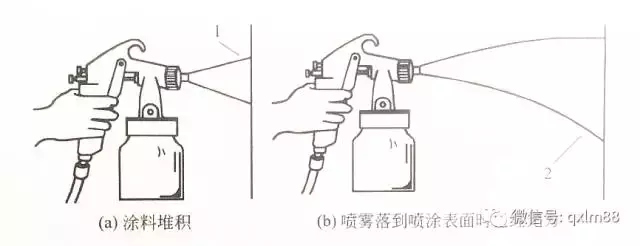 (4)喷枪的移动速度。喷枪的移动速度与涂料干燥速度、环境温度、涂料的粘度有关,一般应约为30cm/s的速度匀速移动。喷枪移动过快,会导致涂层过薄,而喷枪移动过慢,会导致出现流挂的现象。