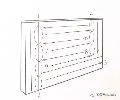 ③小而直立的构件平面的走枪手法。喷涂小而直立的构件平面时是由上而下的形成进行(1-2)然后由左至右(2-3),在由下而上进行(3-4)依次完成(4-5-6-7-8-9)。