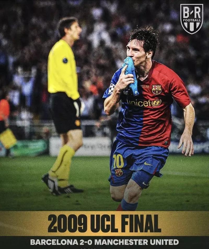 2009年5月27日,梅西赛季最闪耀的时刻。 欧冠决赛,在罗马奥林匹克球场面对曼联时,梅西打入1记头球,实现了对曼联的征服,跟随巴萨赢得了个人第二座欧冠奖杯。