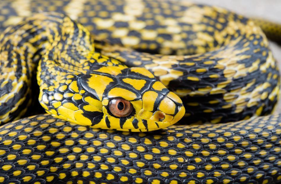 《蛇谱》中提到的《王蛇》其实指的便是它——王锦蛇,民间称号有:菜花蛇、大王蛇、臭黄蟒等,诸多外号都一一代表着其特征性。因为背部是黑色的,夹杂着黄色斑点,酷似油菜花,所以被称为菜花蛇。此外,因其头部有着黑色“王”字斑纹,加上体型较大,也常被称为大王蛇。