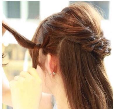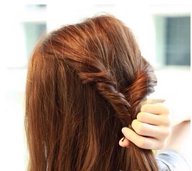第六步:将左边耳朵前方的发丝分成两股,扭转成两股辫。如图所示。