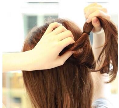 第七步:直至发尾,向后拉至马尾辫的下方。如图所示。