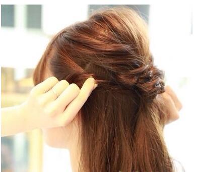 第八步:用发尾缠绕马尾辫的扎发皮筋,直至发尾用发卡固定住,右边耳朵前方的发丝进行同样的处理步骤,这款甜美时尚的编发公主头半扎发就完成了。