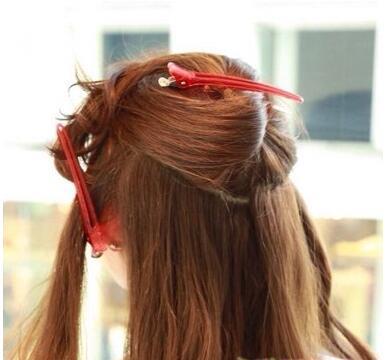 第三步:将全部烫好的发丝分成四部分,即:左右耳朵前方的发丝各位一部分,头顶发丝一部分,脑后发丝一部分,用无恒一字卡将头顶、两耳边的发丝固定住。如图所示。