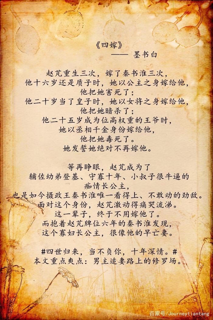 推语:这部作品的立意设定非常新颖,女主因为特殊身世可以死而复生,却因记忆错乱而与男主产生了误会。第四世,她终于查清自己当初死亡的原因,和男主尽释前嫌。非常好看的一部作品。
