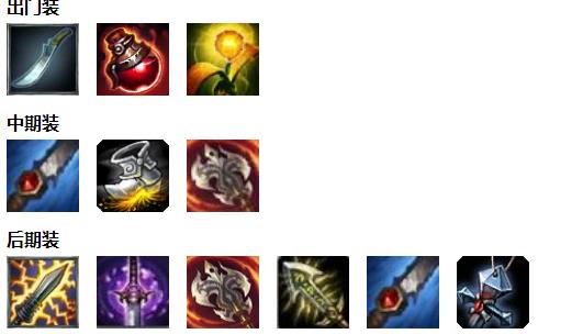 出门打野刀加药水以提供更好的野区续航能列,第一次回家尽快做出提亚马特增加自己的清野效率,后期电刀加无尽配合自己的Q技能和幻像能打出不俗的伤害,幽梦可以根据局势切换成幕刃,面纱大优势可以换成夜之锋刃以提供更高的伤害,后期点出无情猎手可以不需要鞋子换成幽梦来增加自己的机动性和更高的输出能力。
