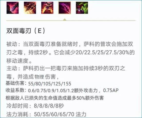 在改版后双面毒刃的伤害也由魔法伤害变为纯物理伤害,在前期是一个小小的加强但是在后期是受到了削弱,这一改动意味着可以从穿甲属性中获取收益,但是也被高护甲比如石头人之类的所克制,扔出了双面毒刃就意味着萨科失去了所有的软控能力。所以单挑的时候不要轻易的交出双面毒刃,除非是面对脆皮时,因为E可以减少平A之后的后摇从而提高自己的连招速度,在满CD的情况下,团战应多次E使伤害达到最大化。(小提示,需要斩杀的情况下,先点燃后E)