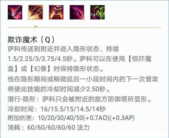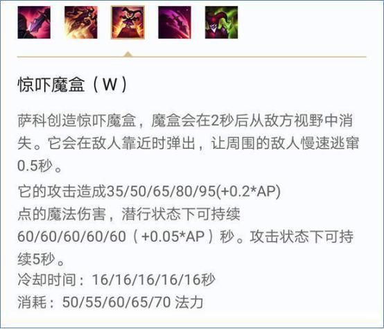 Q技能是萨科的关键技能,推荐作为萨科的主加技能,400的距离使得欺诈魔术可以跳过峡谷中所有的墙体,厚一点的墙体则注意需要贴边,在满CD时欺诈魔术只有5.9秒的AD,但是萨科本身并不具备二段位移,玩秒杀的通常是需要的那个第二个Q技能在打伤害,其他打法看情况来使用Q技能进行追击或者撤退。在欺诈魔术的期间放置惊吓魔盒和分身是不会显形的,但是盒子和分身是会立即显形的,推荐在放盒子的同时打出伤害避免盒子被发现(小提示:小丑是可以不带闪现的,Q技能比闪现好用)