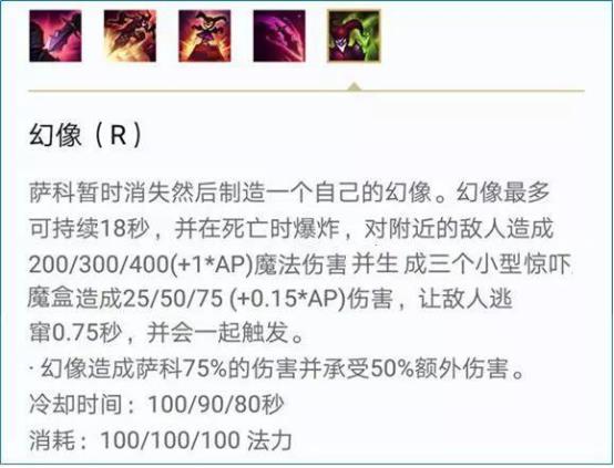 分身可以继承真身的攻击特效,在分身的瞬间可以同时触发双倍的三项和幕刃的伤害,一般情况下Q+R瞬间爆发的双倍伤害是萨科的爆发连招,几乎可以秒杀掉一切脆皮,但这个连招会有0.5秒左右的延迟并且交掉了自己保命技能,所以这套技能的使用时机需要注意。分身会继承本体的75%伤害和一切属性,这个是按照使用幻象时自己的状态而定的,在特定情况下使用幻象分身会比本体的伤害高很多。在释放幻象时的施法时间内萨科会免疫除持续伤害外的所有伤害,用的好的话是可以躲掉很多关键技能的。对于法伤流萨科来说幻象玩的好不好是决定自己超神还是超鬼的决定性因素。(小提示:丛刃触发期间开启幻象分身会一直享用丛刃带来的攻击速度且没有次数限制)