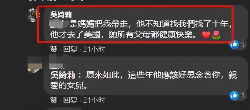也有一种说法是郑黎明偷偷地把吴绮莉带走了,而他的父亲找了她们母女两个10年,十年后找不到她们才去了美国。