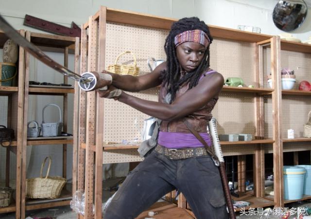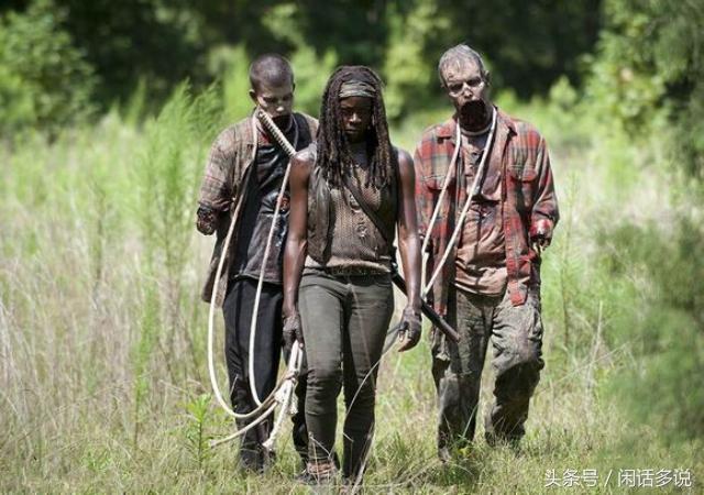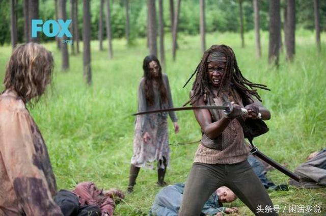 还记得这一幕吗?幽暗的树林中,米琼恩牵着她的两个行尸出场了。她的脸上没有半分惶恐,黑色的皮肤上尚且存留着斑斑血迹,手中紧紧地拴住铁链,而铁链则是拴住了她的行尸朋友,行尸在欲望的控制下一直往前走着,发散出的气味掩盖了米琼恩作为人类的气息。米琼恩的背上带着一把她赖以成名的武士刀,而这武士刀,是一刀就把行尸朋友的牙齿和下巴进行了分离,保证了她的安全。